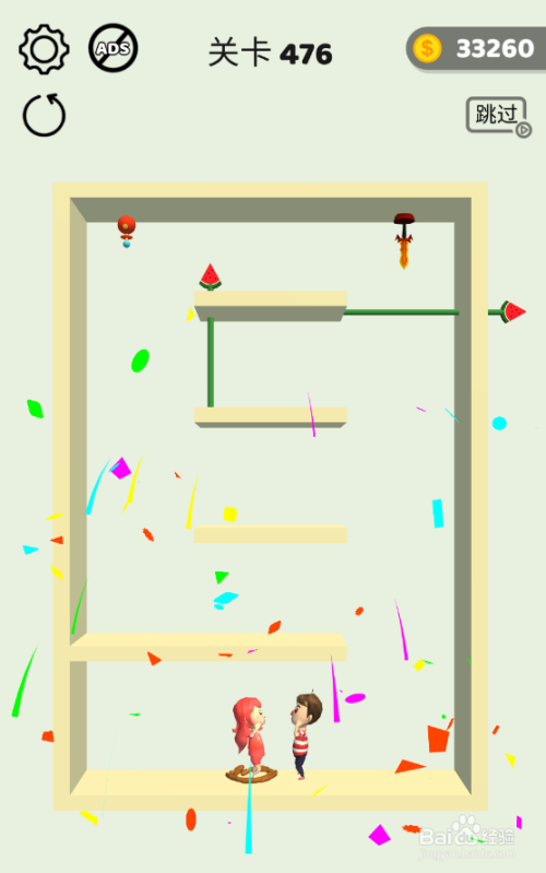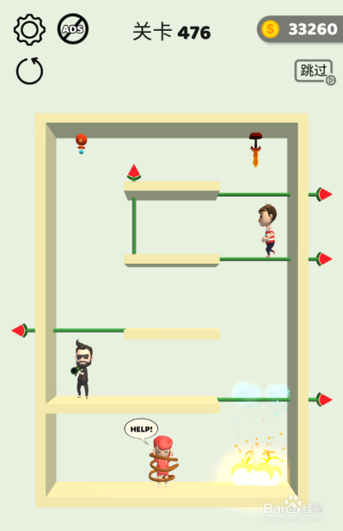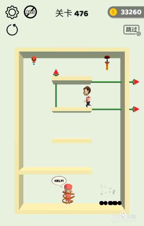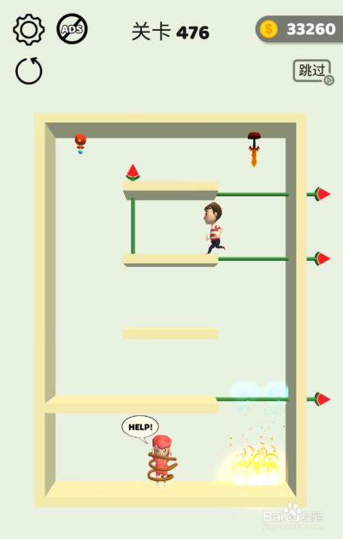 这个关卡的少年在山君上侧平台上,使命是解救底部的小女孩,环境如图。