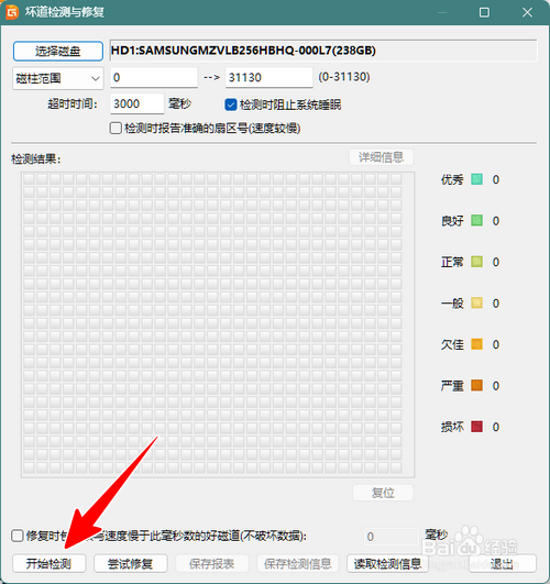 检测起头以后,软件会按照固态硬盘各个柱面的康健状态用差别颜色的小方块举行标注。