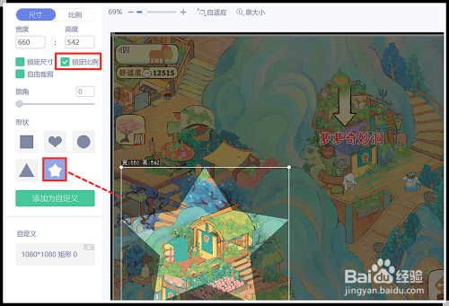 单击选择“五角星”的外形,可以锁定尺寸、比例,也可以自由裁剪想要的外形。