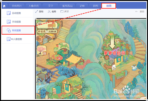 再者就是利用“抠图-外形抠图”功效,选择五角星外形举行抠图,点四周的圆点调解位置和巨细。