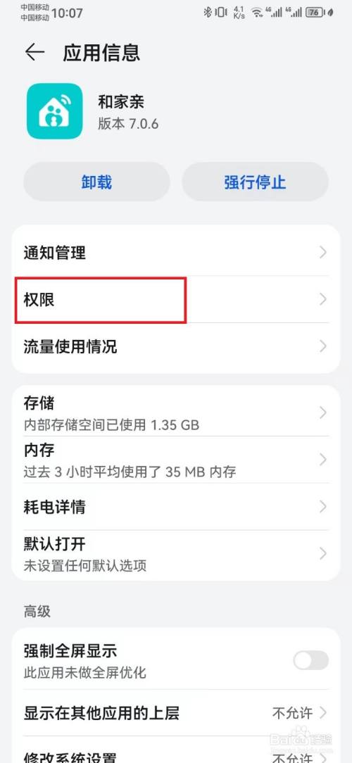 在和家亲应用信息页面,选择【权限】选项。