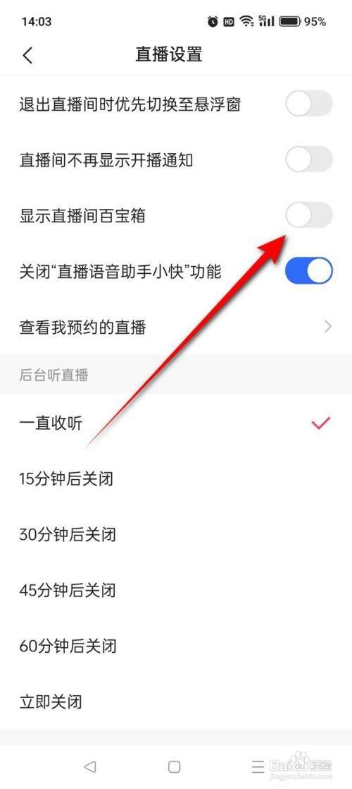 将“显示直播间百宝箱”旁的小滑块点暗即可封闭显示。