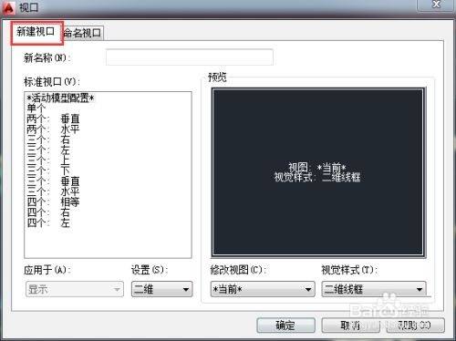 第三步:在弹出的【视口】面板中切换到【新建视口】选项卡,输入视口的名称“我的视口”,并选择视口样式(如图所示)。