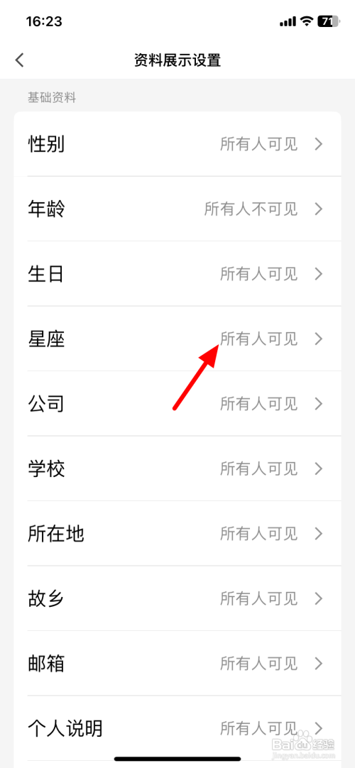 在资料展示设置界面,点击星座右侧所有人可见。