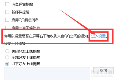 点击【进入设置】,如图。这样我们就可以设置是否在屏幕右下角收到QQ空间通知了哦~