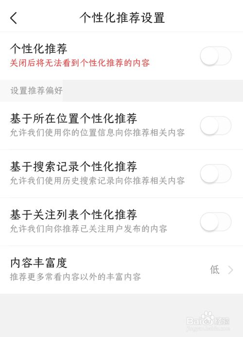 打开如下图界面,选择个性化保举选项,点击封闭后面的开关