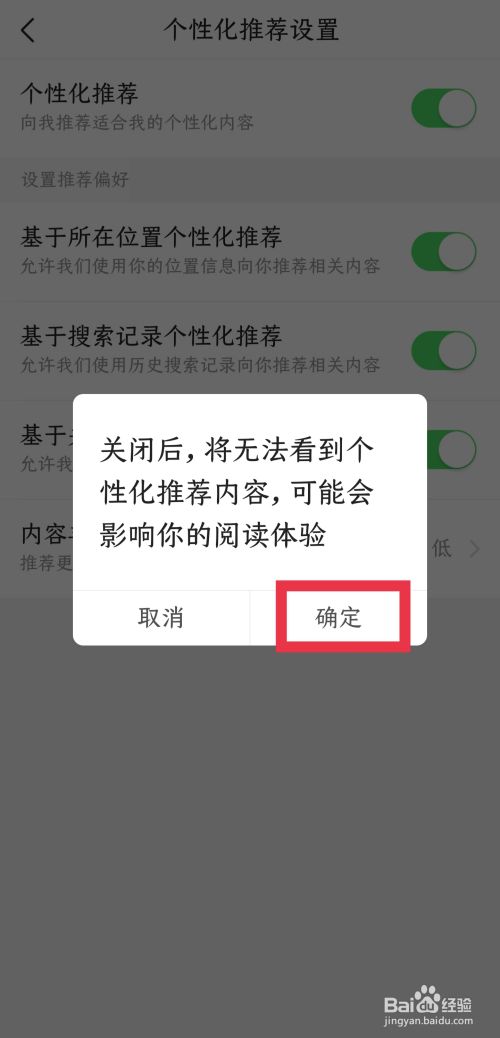 弹出如下图界面,提醒是否封闭个性化保举,点击确定按钮