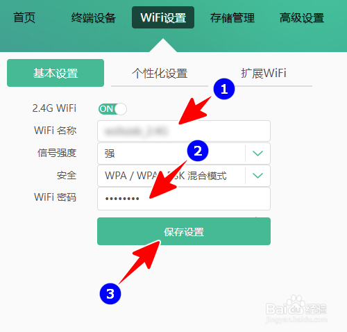 删除失老的 WiFi 名称、密码,输入新的 WiFi 名称、密码,再点击“生存设置”。