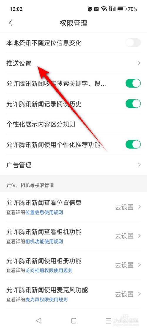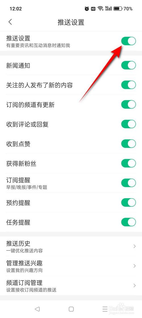 将“推送设置”旁的小滑块点亮即可开启,此时点击小滑块。