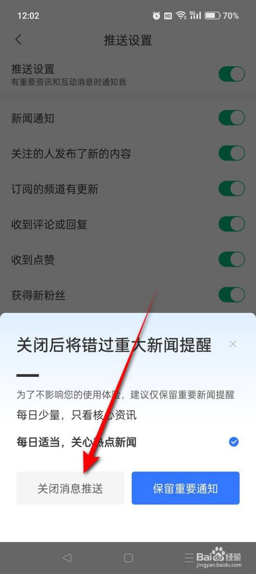 将“推送设置”旁的小滑块点暗即可封闭推送了。