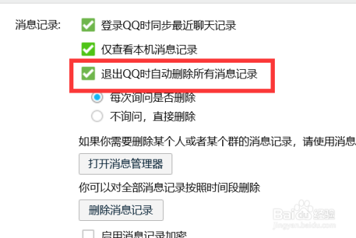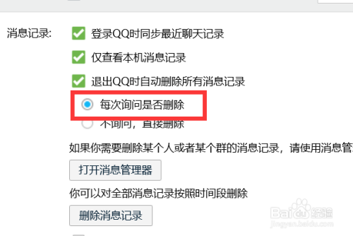 点击【每次扣问是否删除】,如图。这样,每次退出的时辰就会扣问我们是否删除动静记载了哦~