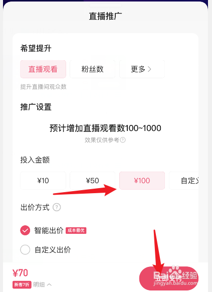 最后,选择推广直播不雅看人数的类型,点击支付即可举行直播间推广