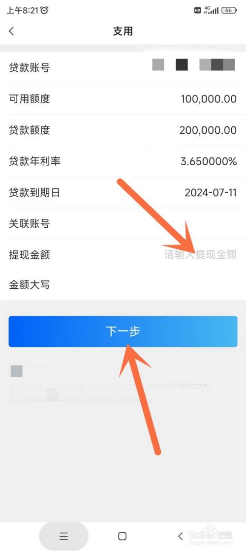 按照提醒,查对贷条目信息,输入提现金额,点击下一步。