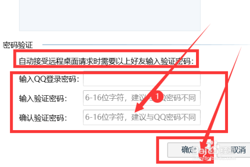 输入我们的登录密码,然后设置我们的验证密码,点击【确定】,如图。这样我们的摰友就要验证密码一致才能和我们成立长途毗连。