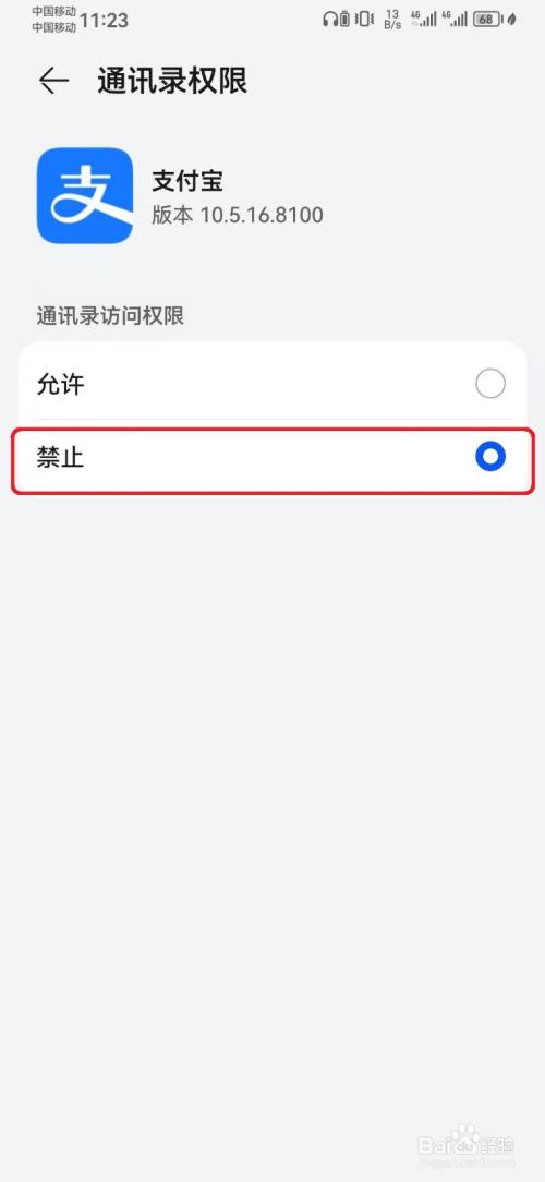 在通信录权限页面,选择【克制】支付宝通信录拜候权限。