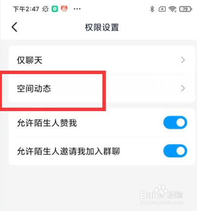 打开手机QQ软件,进入隐私设置界面,点击“权限设置”选项。