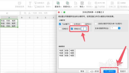 接着我们输入单位格里不需要保留的符号,如【、】作为分列点,然后我们勾选【其他】输入【、】,点击【下一步】。