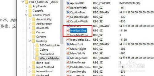 此处的IconSpacing字符串值代表了桌面图标的程度间距,默认值为:-1125,详细的换算要领为:该值=-15*间距像素值,即-1125代表了桌面图标程度间距为75像素,这里将其修改为-1500,即代表着100像素。