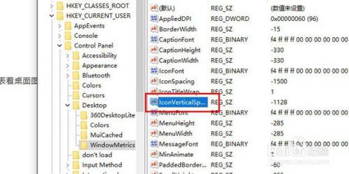 在该注册表页面中找到“IconVerticalSpacing”字符串值,该字符串值代表着桌面图标的竖直间距,该值和程度间距值要连结一致,否则桌面图标就看起来很不雅观了。