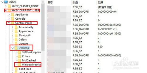 打开注册表编纂器页面之后,双击左侧栏目将注册表子项依次定位至: HKEY_CURRENT_USER\ControlPanel\Desktop\WindowMetrics子项。