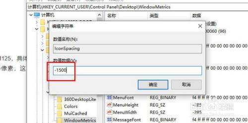 在打开的WindowMetrics子项中,找到IconSpacing字符串值,双击该字符串值,修改其键值。