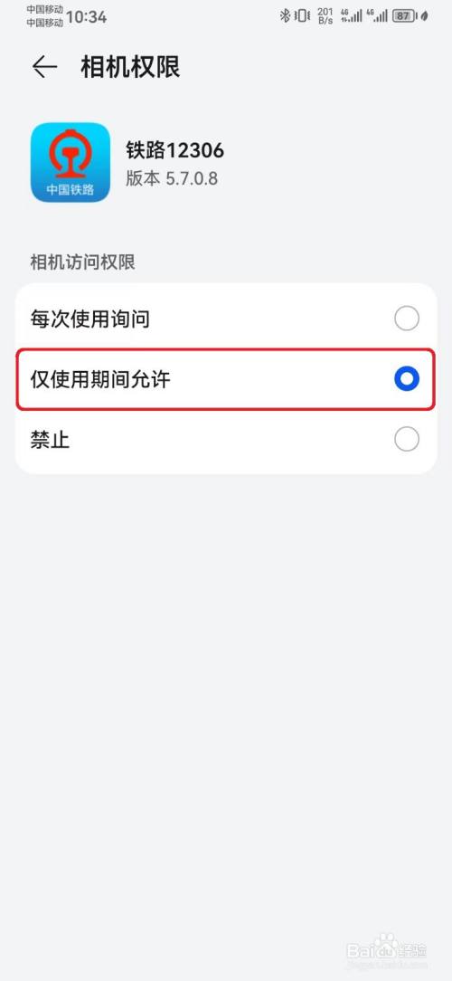 在相机权限页面,选择铁路12306【仅利用时期许可】相机拜候权限。