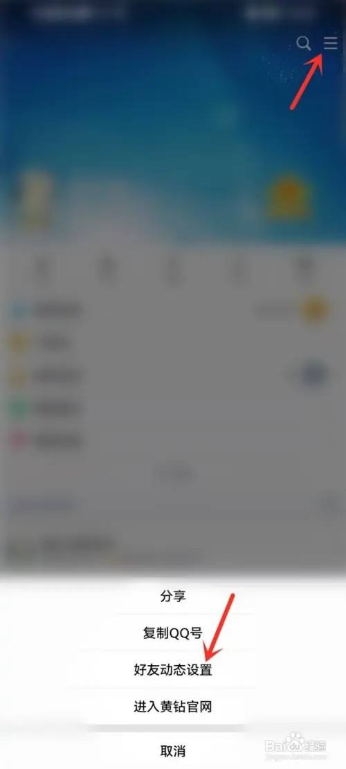 点击右上角【三横】图标,在弹出的窗口中点击【摰友动态设置】。