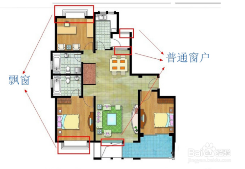 玻璃内的四条横线代表净劫窗户,长的是落地窗,短的是小窗户,带矩形平台的是飘扬窗。