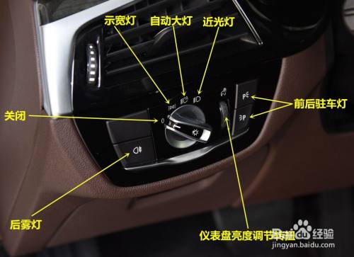 灯光节制区域按键。别离是:示宽灯、主动大灯、近光灯、后雾灯、封闭、驻车灯、仪表盘亮度调治按键。