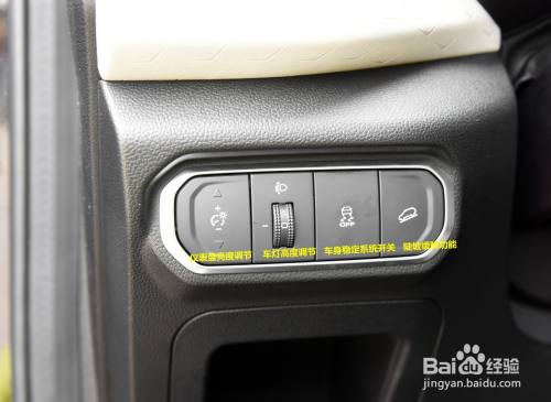 如图,按键依次为:仪表盘亮度调治、车灯高度调治、车身不变体系开关、陡坡缓降功效。