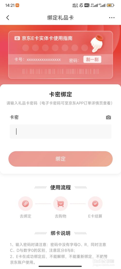 最后,输入京东E卡上的卡密就完当作绑定了