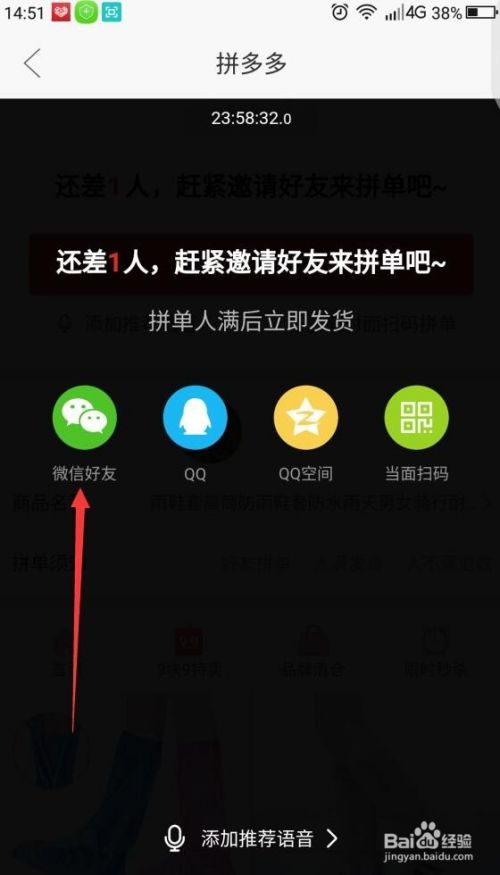第七,这是两人拼团,以是还差一人,要么等候要么点击“邀请摰友拼单”,在弹出的界面中选择邀请的平台,有微信,QQ,QQ空间,劈面扫码。点击微信摰友。