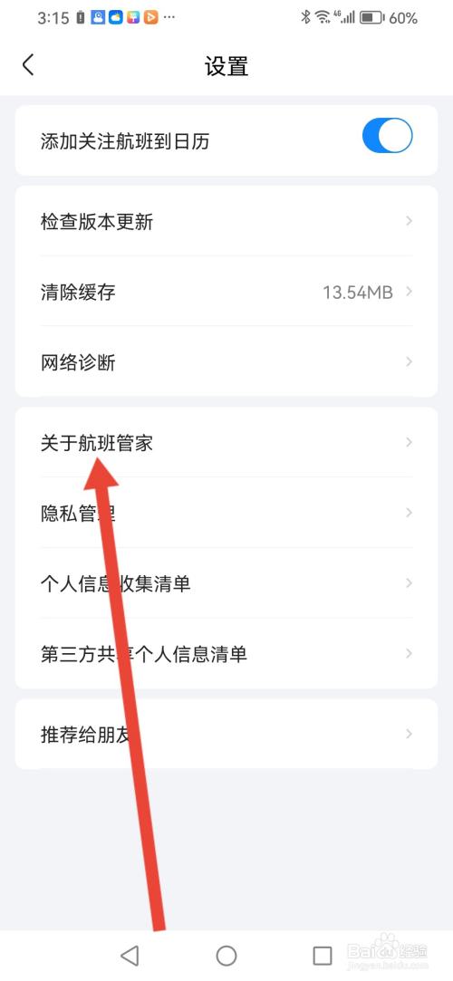 进入设置,点击【关于航班管家】。