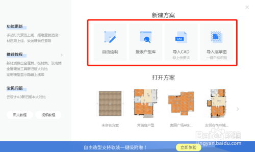 进入设计东西界面,在弹出窗口中有四种新建方案的方式可供选择,即"自由绘制、搜刮户型库、导入CAD文件、导入摹仿图”。