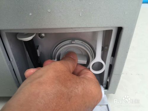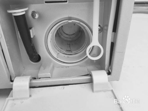 先拔下污水流只管上方的堵头,将洗衣机里残留的水引入小塑料盒等容器。再把堵头插上,将污水流只管卡回原处。