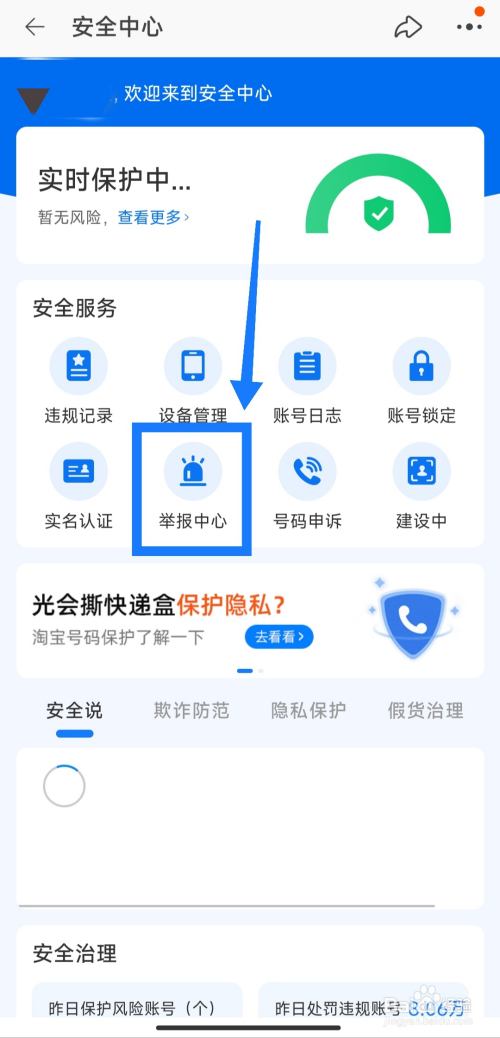 进胆炼入安全中间后,点击“举报中间”