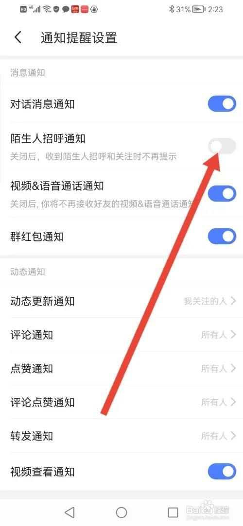 进入动静提示设置,接下来把【生疏人号召通知】的按钮封闭即可。