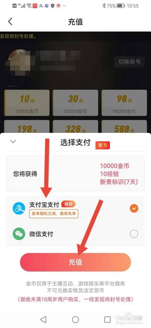 弹出下面的界面,然后选择支付方式,再点击【直播】接下来举行充值操作即可。