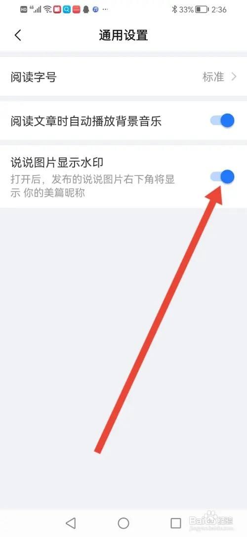 进入通用设置,接下来把【说说图片显示水印】的按钮开启即可。
