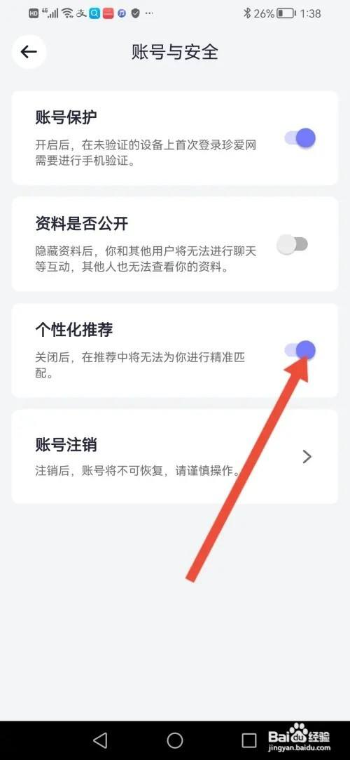 来到账号与安全,然后把【个性化保举】的按钮封闭。