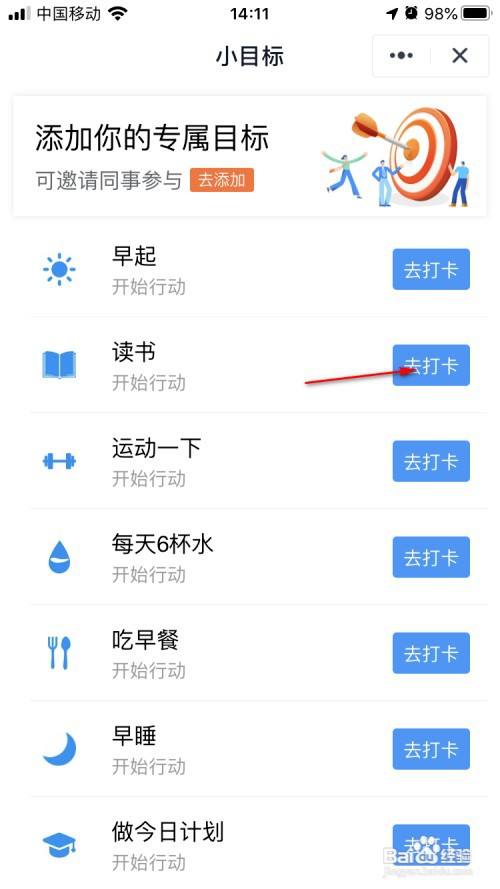 然后,当我们完当作某个方针后,就可以点击【打卡】按钮了。