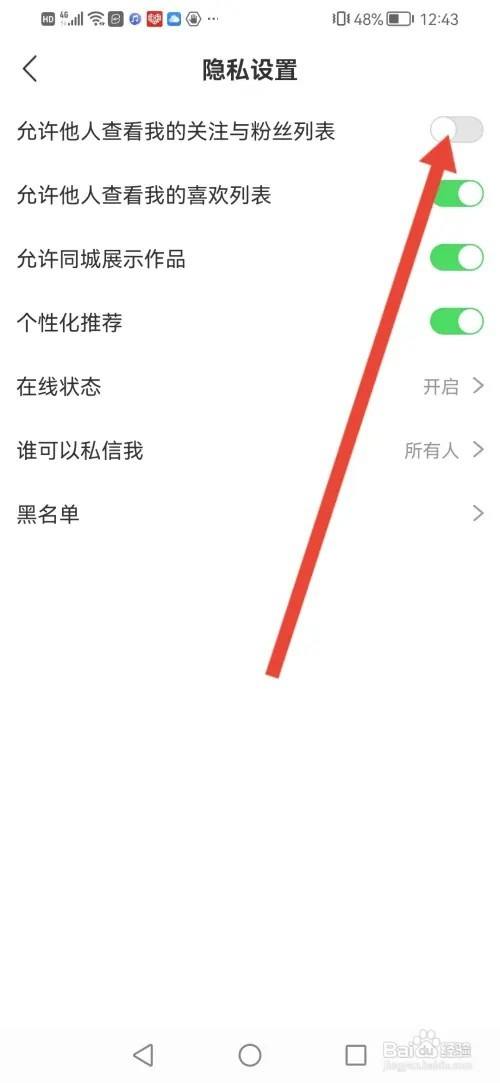 来到隐私设置,接下来把【许可他人查看我的存眷与粉丝列表】的按钮封闭即可。