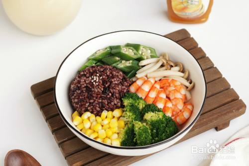 往锅中插手玉米粒、西兰花、秋葵、蟹味菇和去壳的虾仁。