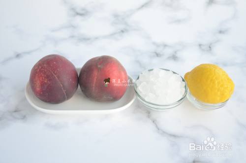 筹办好食材:蜜桃600克获得果肉约450克、冰糖200克、柠檬0.5个;