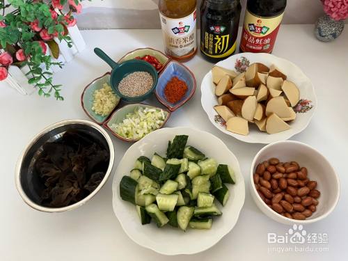 筹办好食材:黄瓜1根切段,素鸡切块,泡发的木耳,蒜切末,小米辣切碎,葱切碎,炸好的花生米,白芝麻,辣椒粉