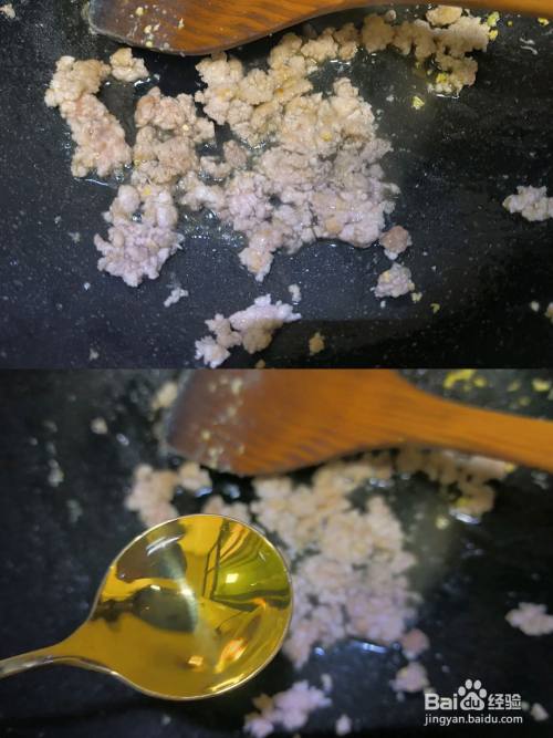 中火从头起锅,锅烧热油将肉沫炒至变色,插手半勺料酒和生抽炒匀