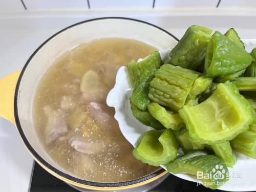 苦瓜去失内里的瓤,切块/切段,怕苦焯一下水备用。为了连结苦瓜的青绿,放点食盐进去一路煮。水开后下锅,3分钟捞出备用。