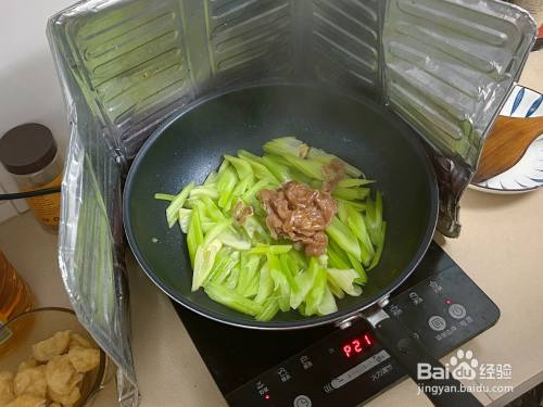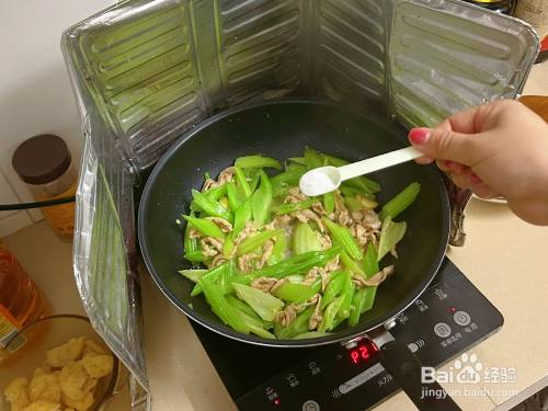 西芹八当作熟时,倒入腌制好的瘦肉,翻炒匀称