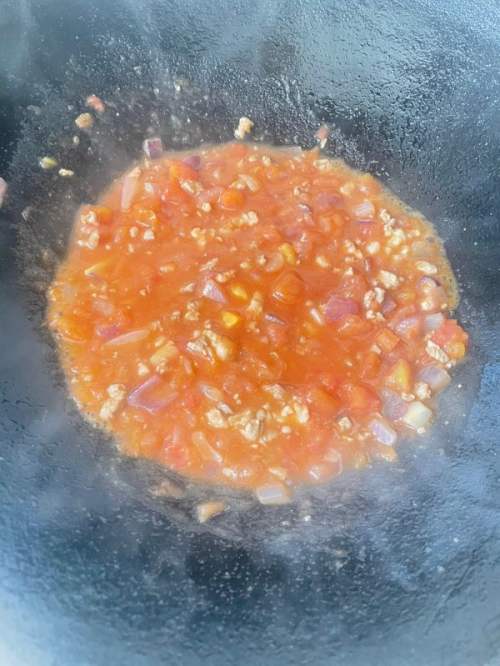 - 6插手刚炒炒好的肉末丁,加少许水、加适量番茄酱,煮浓稠