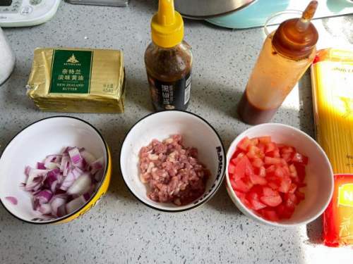 - 1洋葱、番茄切丁,肉切丁加黑胡椒酱、料酒腌制